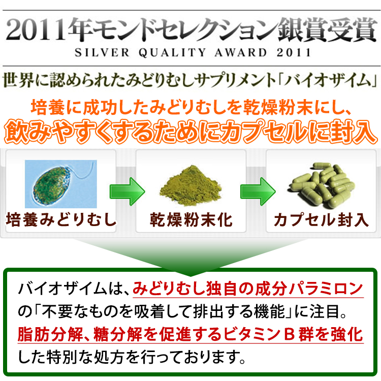 2008年に発売されたバイオザイムは、ミドリムシ(ユーグレナ)が広く認知される以前から発売されていた、「元祖みどりむし」とも言えるサプリメントです。