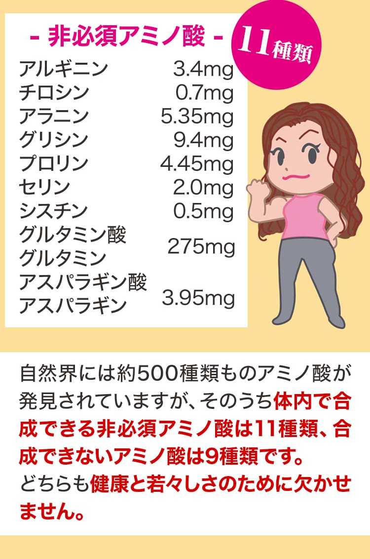自然界には約500種類ものアミノ酸が発見されていますが、そのうち体内で合成できる非必須アミノ酸は11種類、合成できないアミノ酸は9種類です。