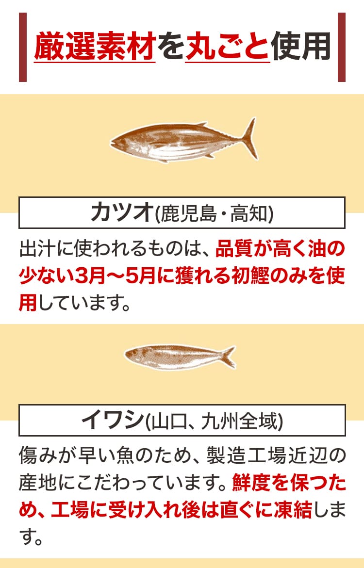傷みが早い魚のため、製造工場近辺の産地にこだわっています。鮮度を保つため、工場に受け入れ後は直ぐに凍結します。
