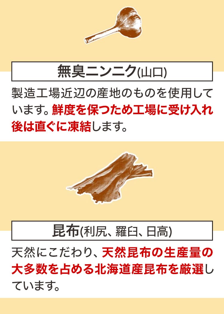 製造工場近辺の産地のものを使用しています。鮮度を保つため工場に受け入れ後は直ぐに凍結します。