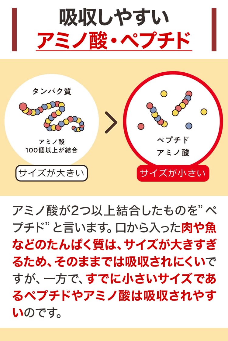 口から入った肉や魚などのたんぱく質は、サイズが大きすぎるため、そのままでは吸収されにくいですが、一方で、すでに小さいサイズであるペプチドやアミノ酸は吸収されやすいのです。