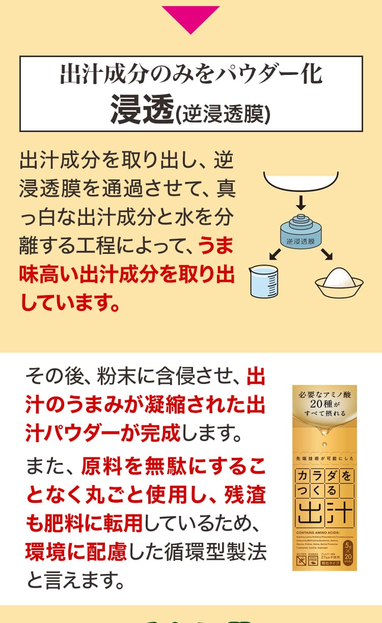 うま味高い出汁成分を取り出し粉末に含侵させ、出汁のうまみが凝縮された出汁パウダーを作ります。
