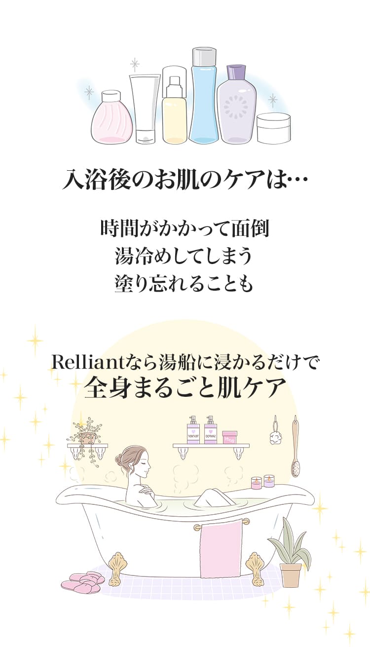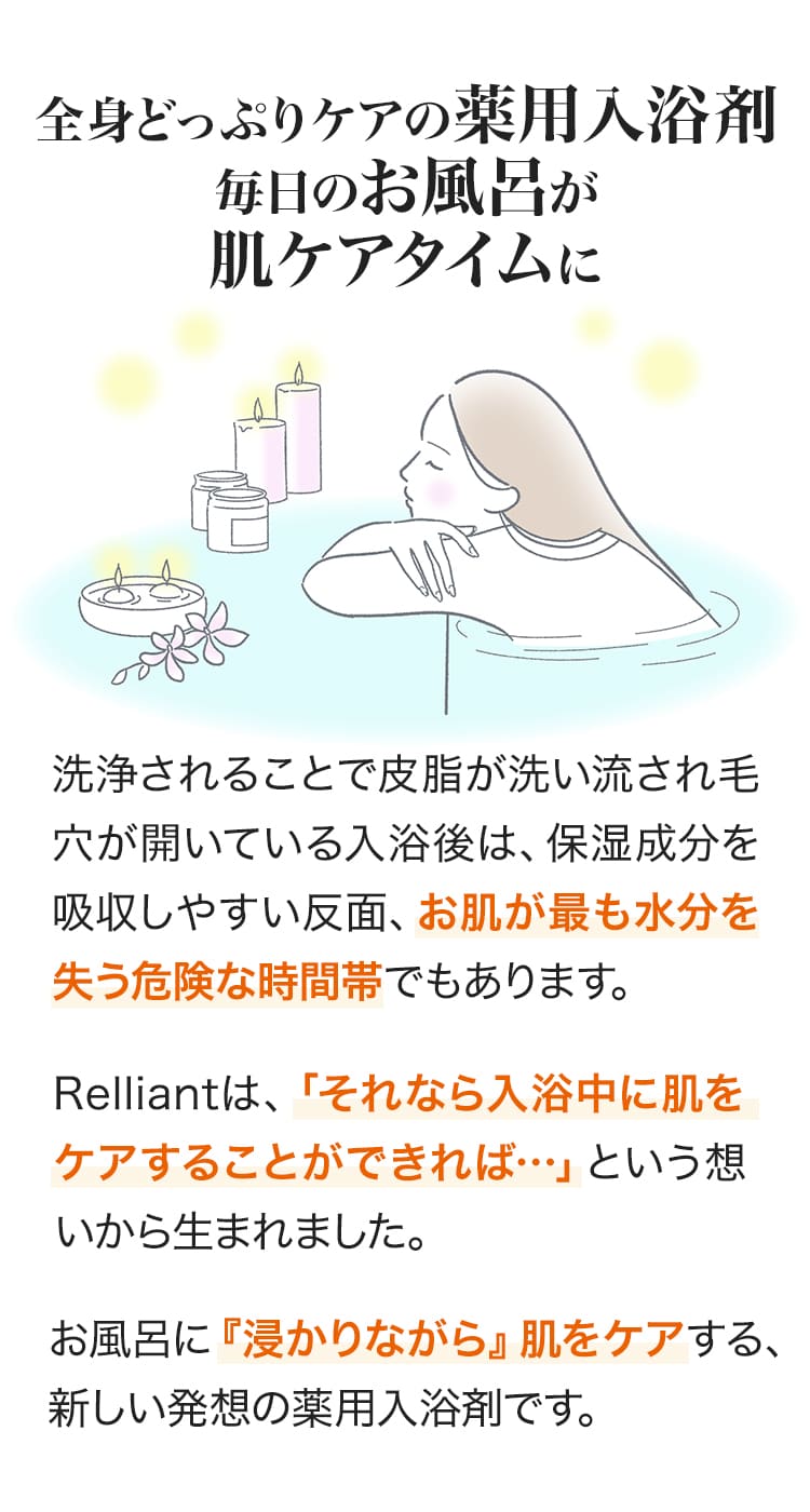 薬用入浴剤・RelliantBATH(リリアントバス)は、「それなら入浴中に肌をケアすることができれば…」という想いから生まれました。