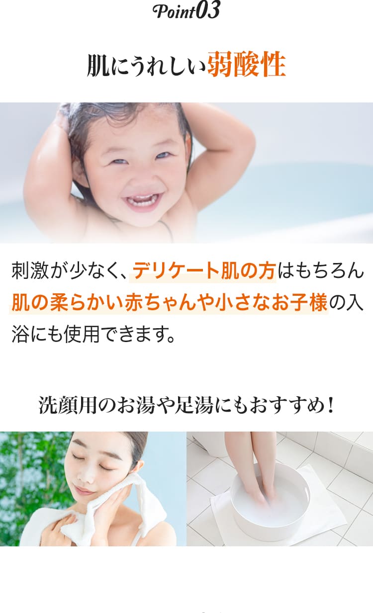 弱酸性の入浴剤は肌の皮脂膜に近いため刺激が少なく、デリケート肌の方はもちろん、肌の柔らかい赤ちゃんや小さなお子様の入浴にも使用できます。