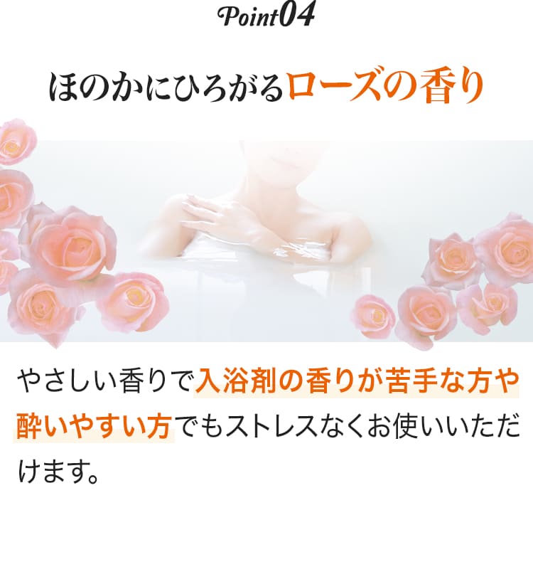 やさしい香りで入浴剤の香りが苦手な方や酔いやすい方でもストレスなくお使いいただけます。
