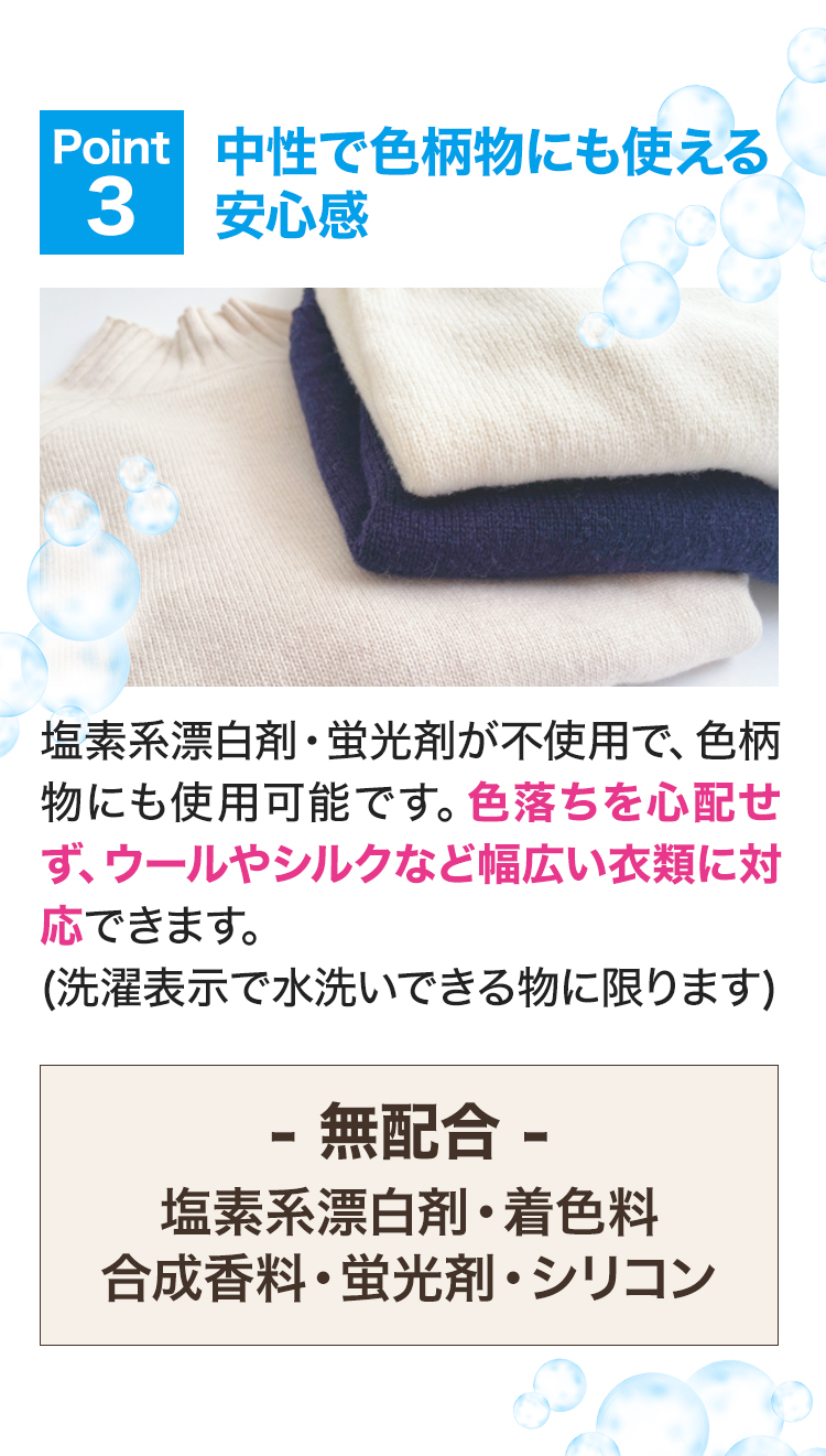 中性洗剤だから色柄物にも使えて、色落ちを気にせず幅広い衣類に使えます。