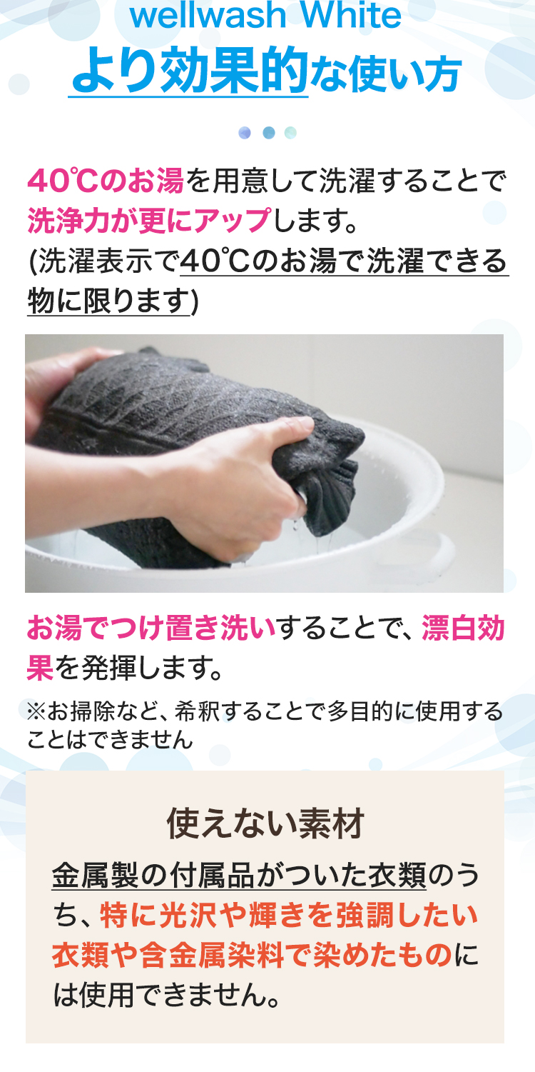 消臭・除菌、さらに塩素系漂白剤と蛍光剤が不使用でデリケート素材や色柄物にも使えます。